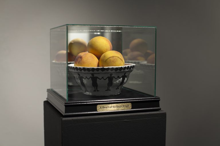 The piece is a memorial for Slavery in the US. I, metaphorically, utilize the story of the cursed peaches of Natchez and create a connection between the Natchez event and the song “Strange Fruit”. According to the story, thousands of slaves affiliated with Union forces died, in Natchez contraband camps. The story says that their bodies have fertilized peach trees that were grown in the Devil’s Punch Bowl. By using real peaches, I also want the audience to recognize the importance of the persistent care that this issue requires. Ignoring to replace peaches with fresh ones will result in rot.